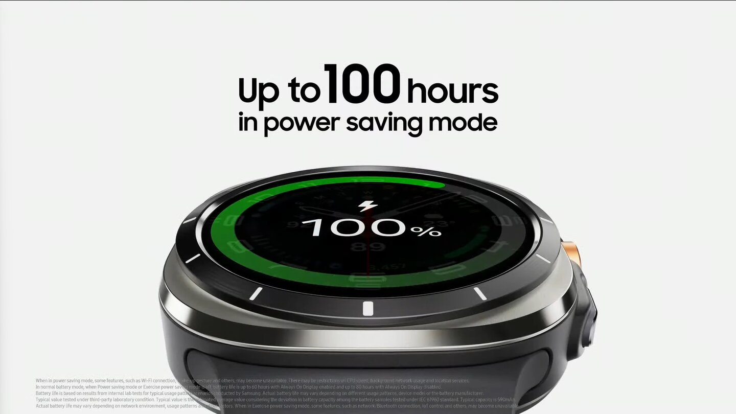 Daraus ergibt sich auch die »längste Akkulaufzeit der Samsung Galaxy Watch-Reihe«: Bis zu 100 Stunden im Energiesparmodus sollen hierdurch möglich sein. Angaben zu regulärer Nutzung gab es bisher nicht.