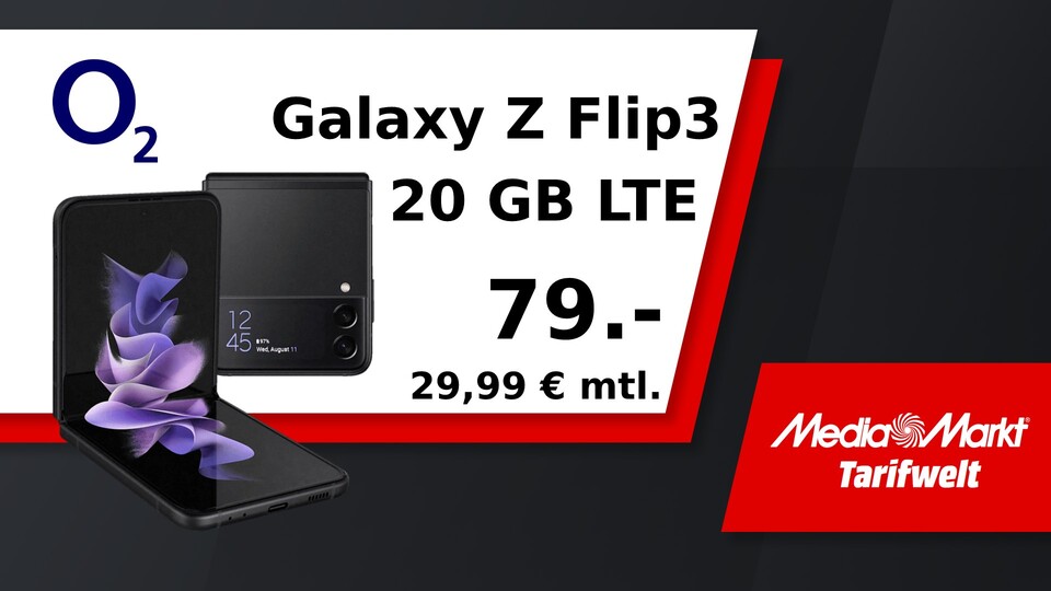Das Angebot in der Übersicht: Bei MediaMarkt bekommt ihr das Samsung Galaxy Z Flip3 in schwarz und mit 256 GB Speicherplatz. Dazu gibt es einen Handyvertrag mit 20 GB Datenvolumen und Allnet Flat im schnellen und stabilen Netz von O2. Der Vertrag hat eine Mindestvertragslaufzeit von 24 Monaten.