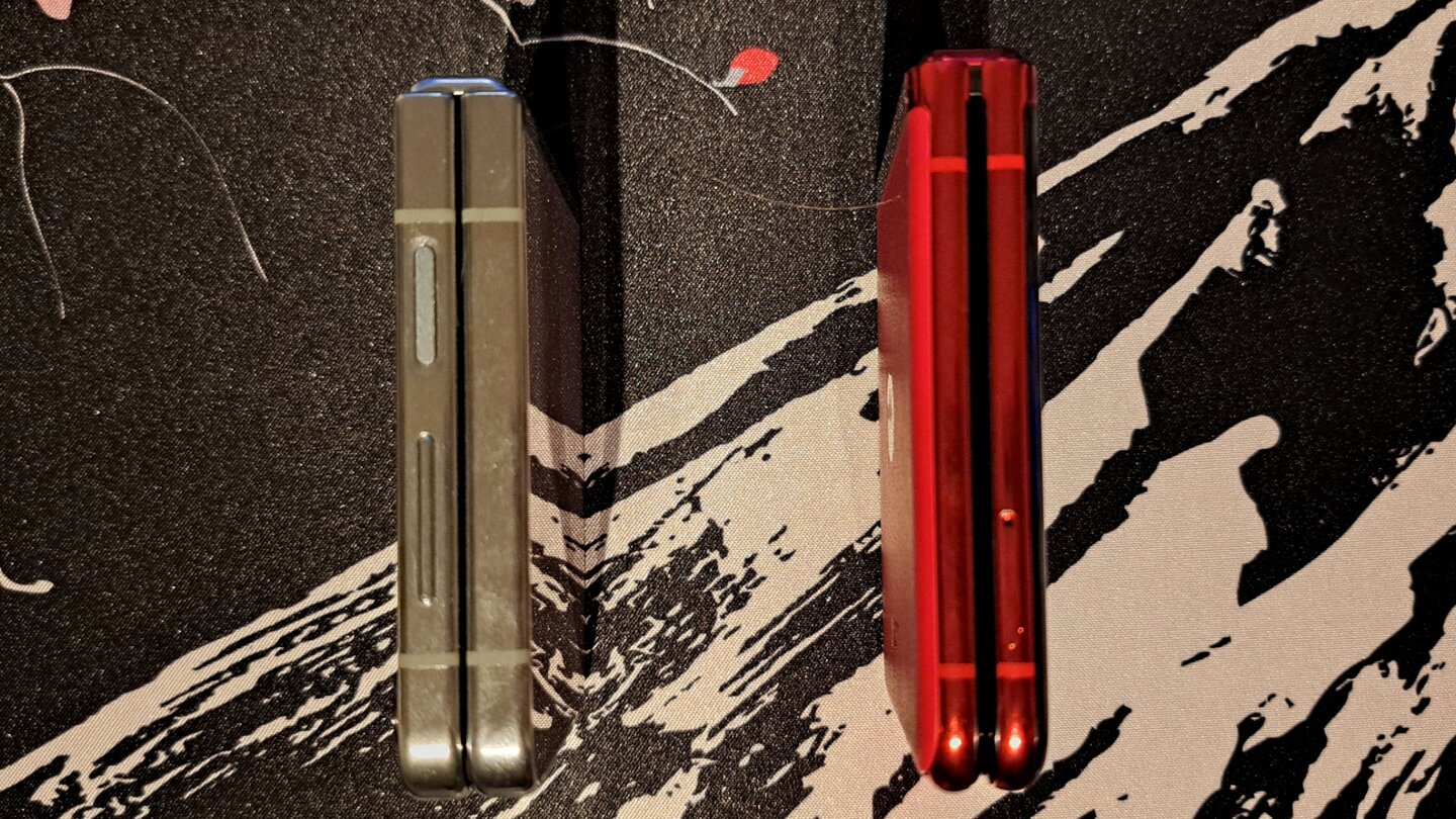 Auch schließen beide Scharniere ziemlich klar ab und haben keine wirklich wahrnehmbare Tropfenform an der Falz. Das Flip 5 scheint mir aber etwas weniger Raum zwischen den beiden geschlossenen Handyhälften zu bieten.