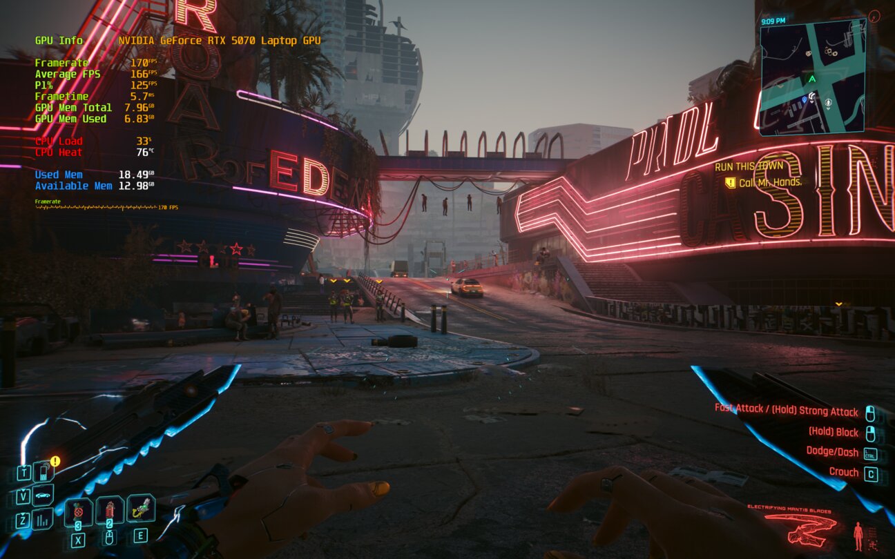 Mit der RTX 5070 Laptop GPU sieht Night City nach wie vor beeindruckend aus. Besonders das Display mit kräftigen HDR-Farben sorgt für ein immersives Spielerlebnis – die grellen Neon-Werbetafeln stechen richtig hervor und lassen das Stadtbild lebendig wirken. Auch auf »Ultra«-Einstellungen läuft der Grafikblockbuster flüssig, und wer zusätzlich DLSS 4 und Multi-Frame-Generation aktiviert, bekommt butterweiche Framerates für ein durchgehend rundes Spielgefühl.