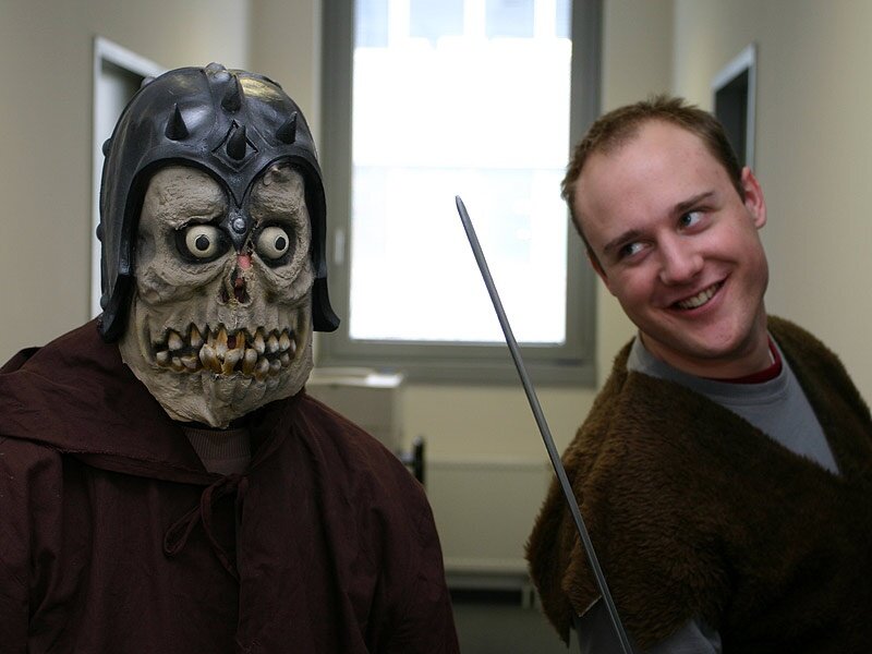 Ein Schnappschuss von den Dreharbeiten zur Folge 6 von » Die Redaktion - World of GameStar «. Wir lüften hier das Geheimnis um den Originaltext, den Daniel M. (rechts) zu Christian M. (links) sprechen sollte: »Christian, ich hab Dir doch gesagt, dass die Face Cream aus Uschi Glas' Kosmetikserie wirklich nicht zu empfehlen ist«. Eine gewisse Uschi G. aus G. (bei M.) intervenierte aber. Von wegen Rufschädigung, und Schadenersatz, und Verklagen, und so Deshalb wurde der Text in allerletzter Minute umgeschrieben, und raus kam irgendwas mit World of WarCraft - vollkommen unwitzig!