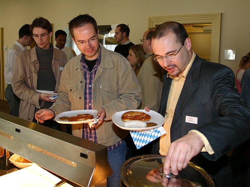 Fesch sans, unsere Madl! André und Gunnar haben sich absichtlich neben die Dirndl-Schönheiten (von links: Rosi Seifert, Christine Freise, Susanne Fütterer) gesetzt, wenn sie schon selber als Gast-Bayern keine Lederhosen anhaben. Als jedoch die Chefredakteure versuchen, das schicke Trachtengewand per Dekret zur Uniform aller weiblichen IDG-Mitarbeiter zu machen, scheitern sie am Betriebsrat. So oder so, nächstes Jahr ist ja wieder Wies'n, Oans, Zwoa, Gsuffa!!!