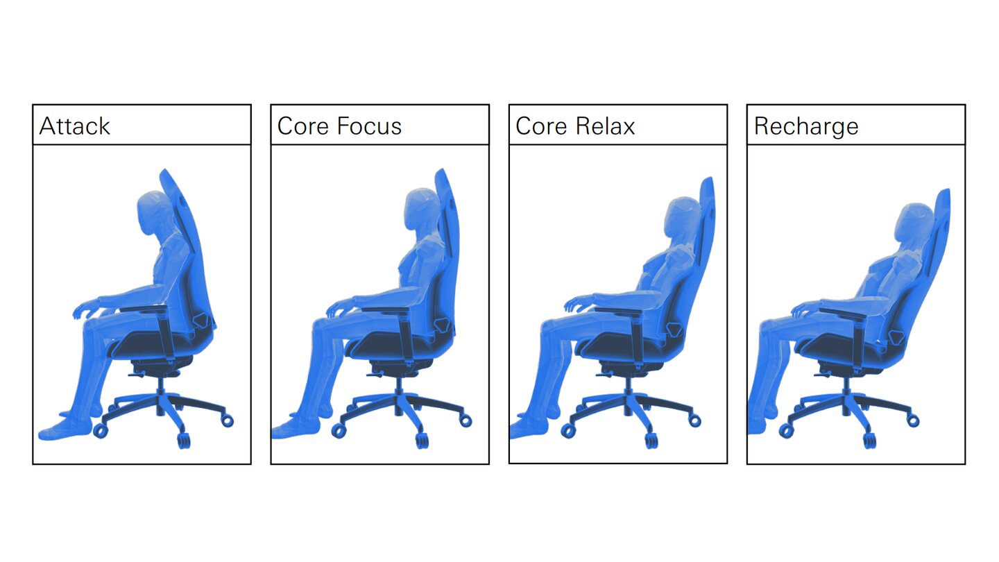 Der Recaro Exo bietet dafür vier auf Spieler ausgerichtete Grundpositionen an, in denen der Stuhl einrasten kann (siehe auch das Bild unten):