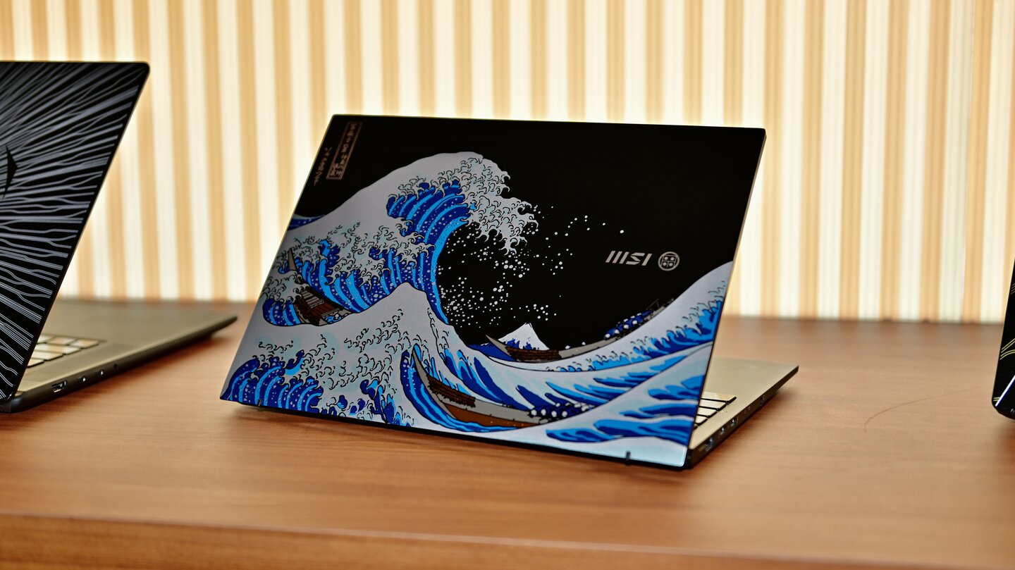 Auf der Rückseite des Bildschirms ziert das berühmte Ukiyo-e-Motiv »Die große Welle vor Kanagawa« von Katshushika Hokusai. Das Kunstwerk wird nicht auf dem Magnesium-Aluminium-Cover aufgedruckt, sondern in aufwendiger Handarbeit in acht Farbschichten aufgetragen.