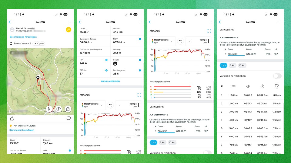 Lediglich bei den Schritten patzt die Vertical 2: Während die Fenix 8 die Schritte präzise misst, übertreibt es Suunto's Modell. Zwar ist die Abweichung nicht mehr so deutlich wie bei der ersten Generation, allerdings zeigen viele andere Smartwatches zuverlässigere Ergebnisse.