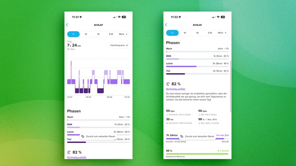 Im Vergleich zum Oura Ring 4 beziehungsweise zur Apple Watch weisen beide Geräte keine Ausreißer auf (mit Ausnahme der Wachphasen). Die Daten zur Schlaflänge stimmen zudem mit dem subjektiven Gefühl überein.