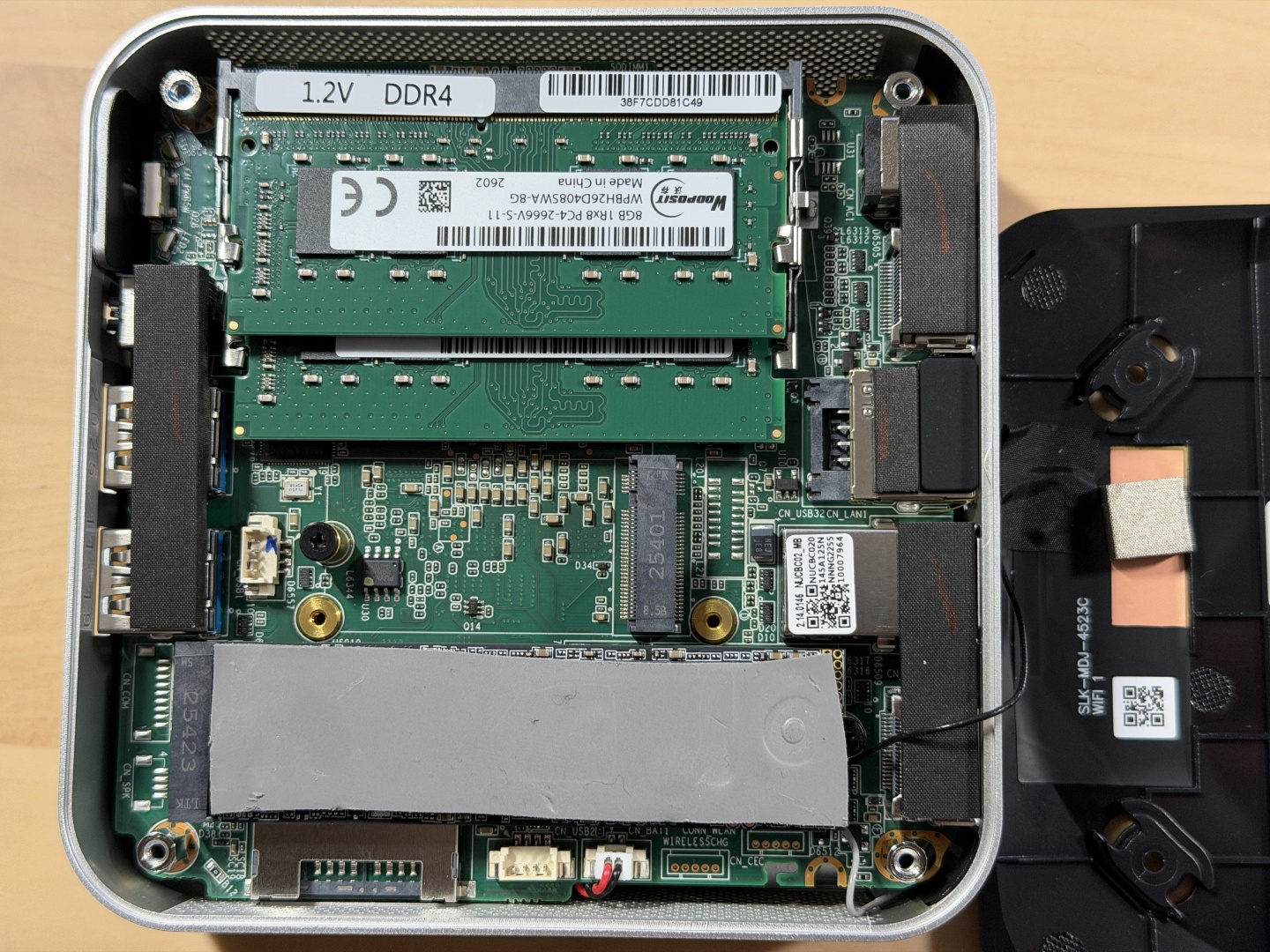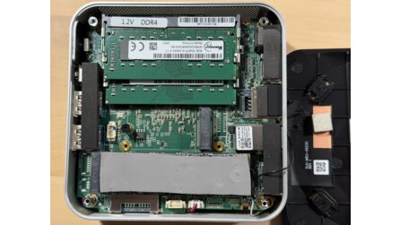 Unter der Bodenplatte befindet sich noch eine Platte aus Metall, die mit vier weiteren Schrauben befestigt ist. Sobald diese dann auch entfernt ist, wird die kleine Hauptplatine sichtbar. Insgesamt gibt es zwei SO-DIMM-Slots, einen Slot für das WiFi-Modul und zwei M.2-Steckplätze (2280 und 2242).