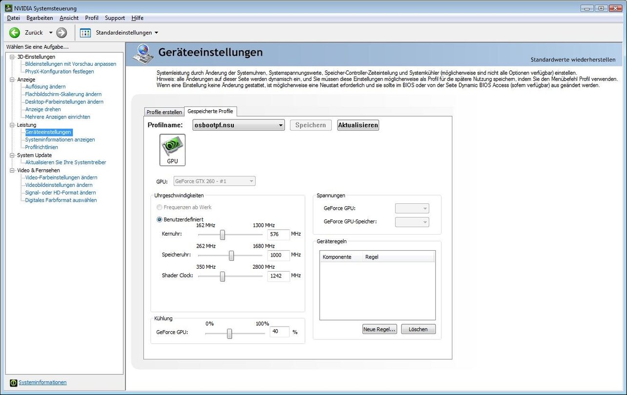 Die rechte Hälfte des Fensters ist in die Reiter »Profile erstellen« und »Gespeicherte Profile« unterteilt. Unter »Profile erstellen« befinden sich drei Schieberegler zum Einstellen von Kern-, Speicher- und Shader-Takt. Der Regler für den Kerntakt ist mit »Kernuhr«, der für den Speicher-Takt mit »Speicheruhr« und der für die Shader-Domäne mit »Speicher Clock« ziemlich unverständlich ins Deutsche übersetzt. Darunter können Sie die Drehzahl des Lüfters in Prozent einstellen. Neben allen Reglern befinden sich zusätzlich noch Felder zum Eintragen numerischer Werte, wenn die Präzision des Reglers nicht ausreicht. Rechts daneben befinden sich zwei Drop-Down-Menüs zum Einstellen der GPU- und Speicher-Spannung. Auf unseren Testgrafikkarten, einer Geforce 9800 GTX und einer Geforce GTX 260, ließen sich allerdings keine Spannungswerte ändern. Darunter ist das Menü platziert, mit dem sich Regeln für die Taktsenkungen ohne und mit wenig Last und die Lüfterdrehzahlen erstellen lassen. Unsere Versuche, die Lüftersteuerung mit eigenen Temperatur- und Drehzahl-Werten anzupassen, scheiterte auf allen Testgrafikkarten und -systemen. Da die möglichen Takteinstellungen der Nvidia System Tools nur eine relativ beschränkte Steigerung zulassen, verweden Sie besser den Riva Tuner.