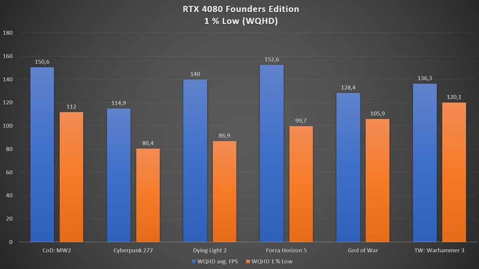In den meisten von mir getesteten Spielen liegt das 1 Prozent der niedrigsten FPS knapp hinter der durchschnittlichen Bildrate. Das gewährleistet einen sehr guten und flüssigen Spieleindruck. Aber auch bei Forza Horizon 5 konnte ich die minimalen Bildrateneinbrüche praktisch nicht spüren, obgleich hier der Abstand deutlich größer ausfällt als bei den anderen Titeln. Das liegt vor allem daran, dass die minimalen FPS mit knapp 84 Bildern pro Sekunde immer noch sehr hoch ausfallen.
