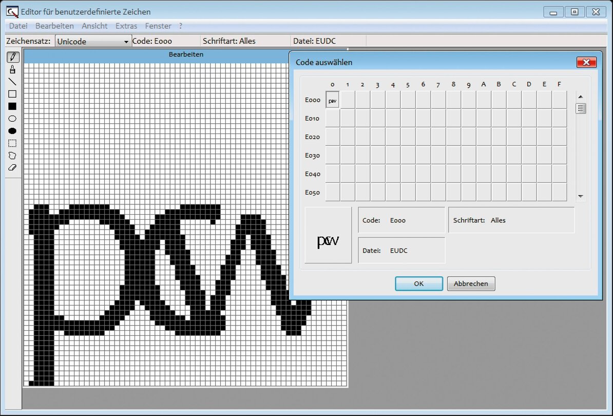 Im Fenster "Code auswählen" klicken Sie auf das Kästchen in der linken oberen Ecke und dann auf "OK". Im Editor-Fenster zeichnen Sie dann einfach mit der Maus Ihr Schriftzeichen oder Symbol. Mit "Fenster, Verweis" können Sie ein beliebiges bereits vorhandenes Zeichen öffnen, etwa um es komplett oder teilweise zu kopieren und dann weiterzubearbeiten.
