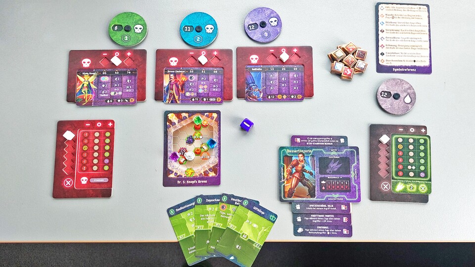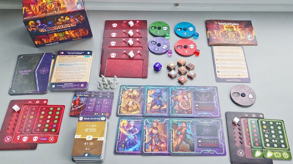 Auch wenn die Kämpfe hier meist nur einem Raum im großen Gloomhaven entsprechen, hat man es tatsächlich geschafft, das klassische Gloomhaven-Feeling rüberzubringen. Die Kämpfe sind wie gewohnt herausfordernd, aber dennoch machbar. Zur Not kann man den Schwierigkeitsgrad der Gegner anpassen. Für so eine kleine Schachtel steckt ganz schön viel Glooomhaven in Knöpfe & Krabbler!