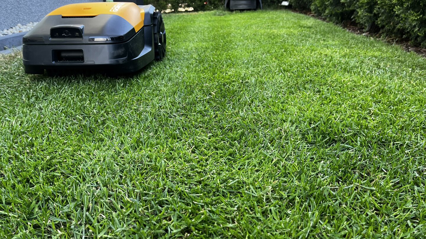 Vor allem auf freier Fläche arbeitet der Roboter sauber und zuverlässig. Bei regelmäßigem Einsatz entsteht ein gleichmäßiges, gepflegtes Schnittbild. Nachbessern müsst ihr per Hand aber spätestens um Hindernisse herum sowie an den Rasenkanten, die baubedingt nicht komplett frisiert werden.