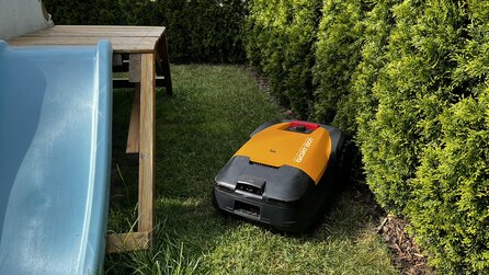 Mit ca. 35 Dezibel in fünf Metern Entfernung ist der Mähroboter angenehm leise. Damit eignet er sich auch für Einsätze früh morgens oder in dicht bebauten Wohngegenden. Der Drehteller mit drei Messern hat zudem ordentlich Dampf – teilweise flogen bei mir die abgeraspelten Grashalme aus dem Heck des Roboters.