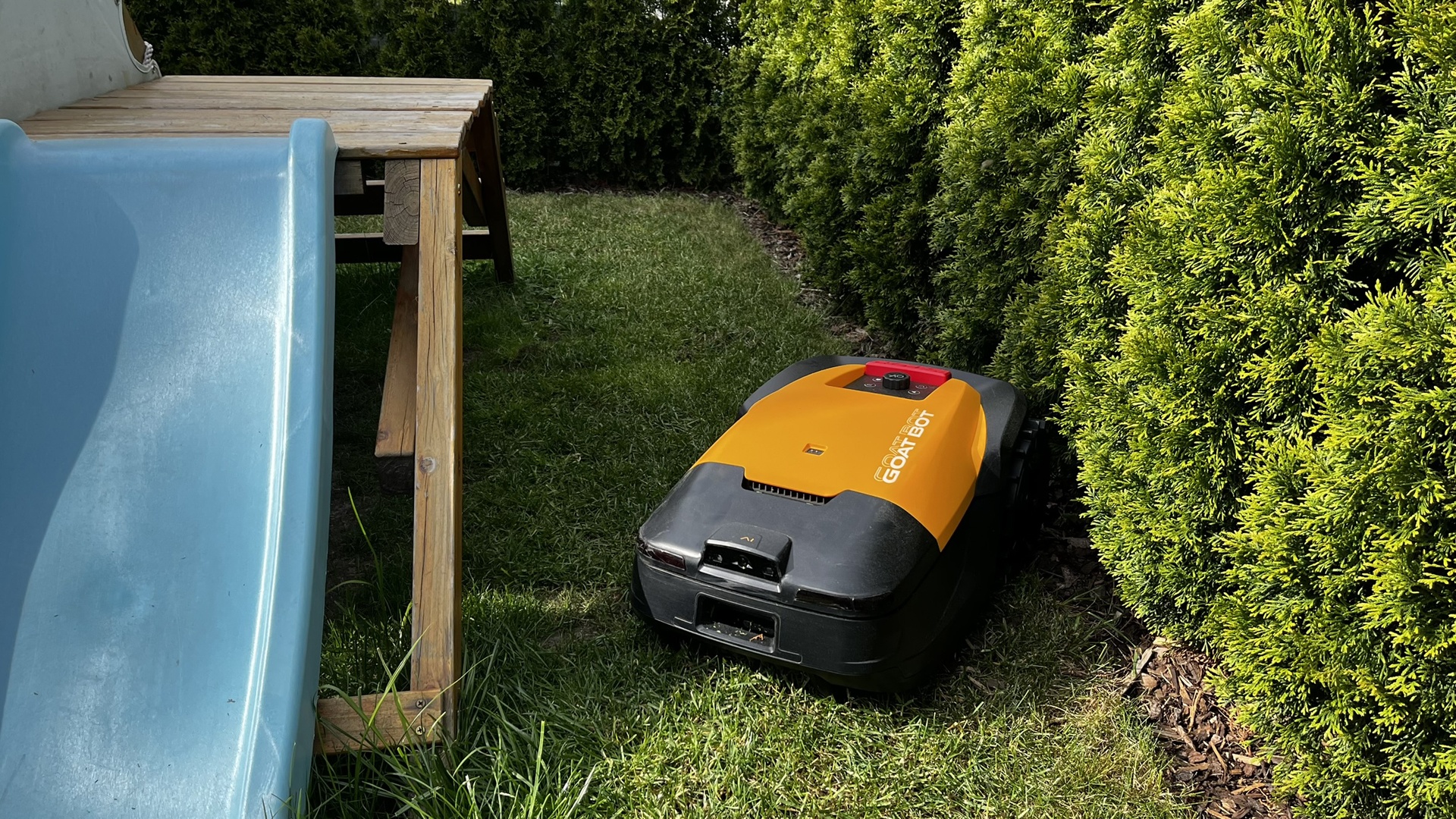 Enge Passagen meistert der Goat Bot durchaus, allerdings nicht immer zuverlässig. Zwischen meinen Koniferen und dem Klettergerüst meines Sohnes etwa blieb der Roboter manchmal einfach stehen, obwohl es genügend Platz zum Wenden gegeben hätte.
