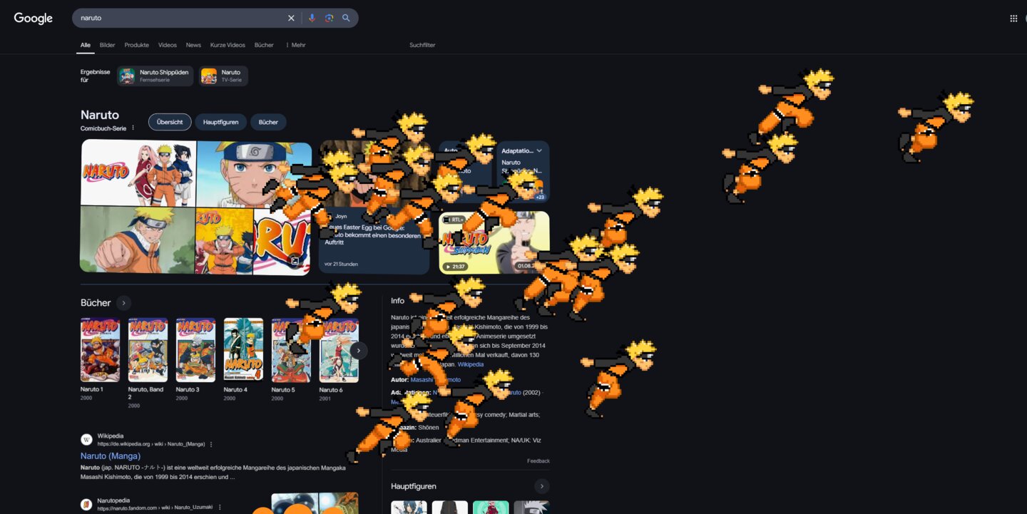 Was seht ihr da genau? Beim Drücken auf den Button scheinen die Suchergebnisse kurz zu beben, bis ein einzelner Pixel-Naruto über den Bildschirm läuft, gefolgt von dutzenden weiteren Pixel-Narutos.