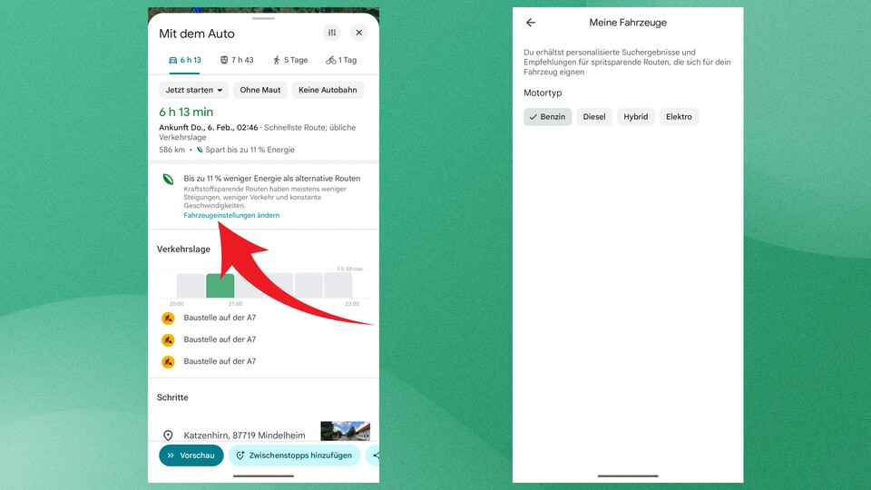 Nun berechnet Google Maps immer die sparsamste Route für euer Auto und zeigt euch im Infopanel an, wie viel Prozent Kraftstoff ihr auf dieser Route im Gegensatz zu den Alternativrouten sparen könnt: