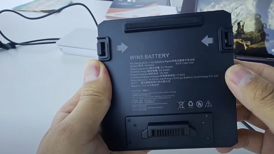 Ja, ihr habt richtig gelesen: Der GPD Win 5 hat keinen eingebauten Akku. Stattdessen wird ein externer 80-Wh-Akku an die Rückseite geklippt. Dieser besitzt eigene Lüftungsschlitze, damit die beiden Lüfter auf der Rückseite nicht blockiert werden. Geladen wird der Akku über eine Docking-Station.