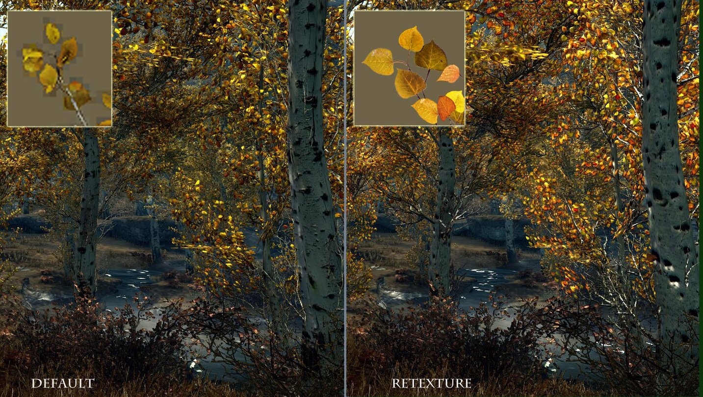 Die Flora spielt eine besondere Rolle für die Glaubwürdigkeit einer Spielwelt. In Skyrim sehen die Wälder zwar schon unmodifiziert so authentisch aus wie in kaum einem anderem Spiel, trotzdem ist noch Luft nach oben. Der Modder »vurt« liefert mit seiner Mod schärfere und teilweise komplett ersetzte Texturen für die Bäume in Himmelsrand. Wie in vielen anderen Modifikationen sind auch hier mehrere Voreinstellungen verfügbar, mit denen man die Farbgebung an seine Bedürfnisse anpassen kann.