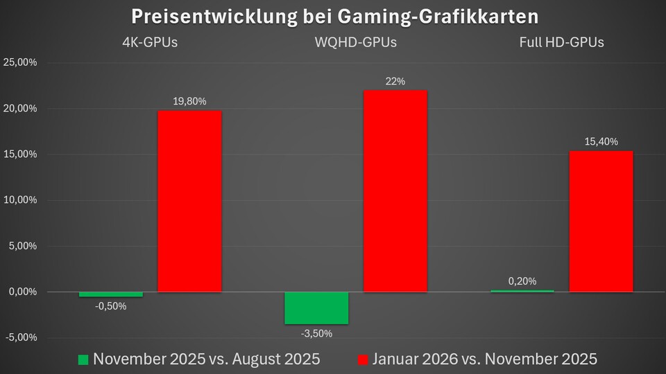 - Im 4K-Bereich sieht es sogar noch schlechter aus, wenn man die bislang weniger stark betroffenen AMD-Modelle ausblendet. Beschränke ich mich auf die RTX 5090, 5080 und 5070 Ti, liegt der Preisanstieg im Schnitt bei fast 28 Prozent.