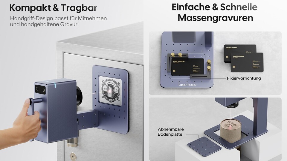 Die Produktivität ist ein Schlüsselfaktor, wenn es um umfangreichere Gravurprojekte geht. Der LaserPecker 3 verfügt über eine vielseitige Basis, die das Fixieren und Einstellen von Gravurobjekten für die Stapelverarbeitung erleichtert. Diese Positionierungsplatte am Sockel ist ein wahrer Gamechanger. Ihr könnt mehrere Objekte gleichzeitig gravieren, ohne euch Gedanken über die genaue Platzierung machen zu müssen.