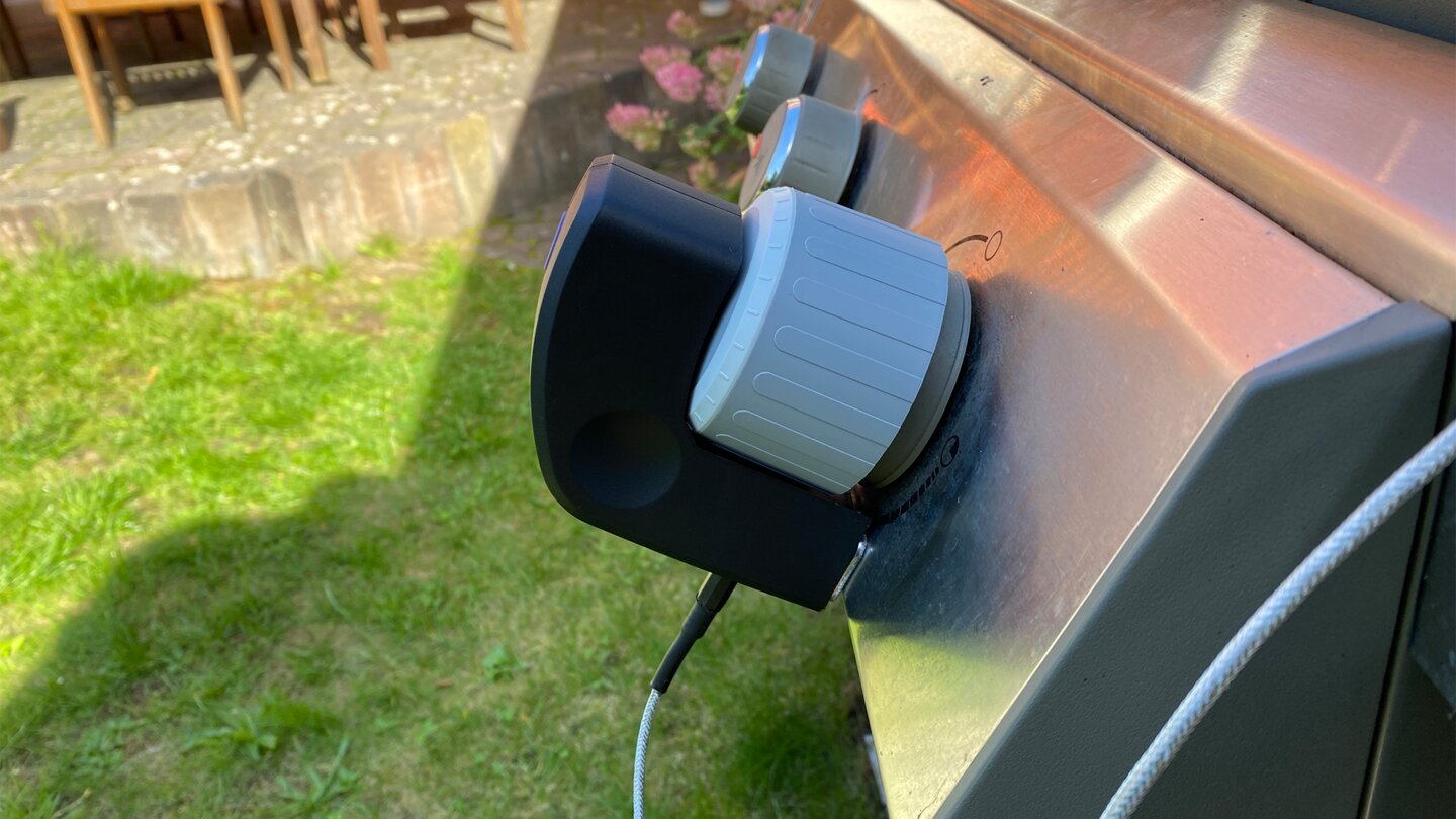Nachdem ihr es geladen habt, bringt ihr das Grill Control über einem der Schaltknäufe an. In meinem Fall musste ich den mitgelieferten Magneten unterhalb des Griffs ankleben, dann hielt Grill Control allerdings bombenfest.