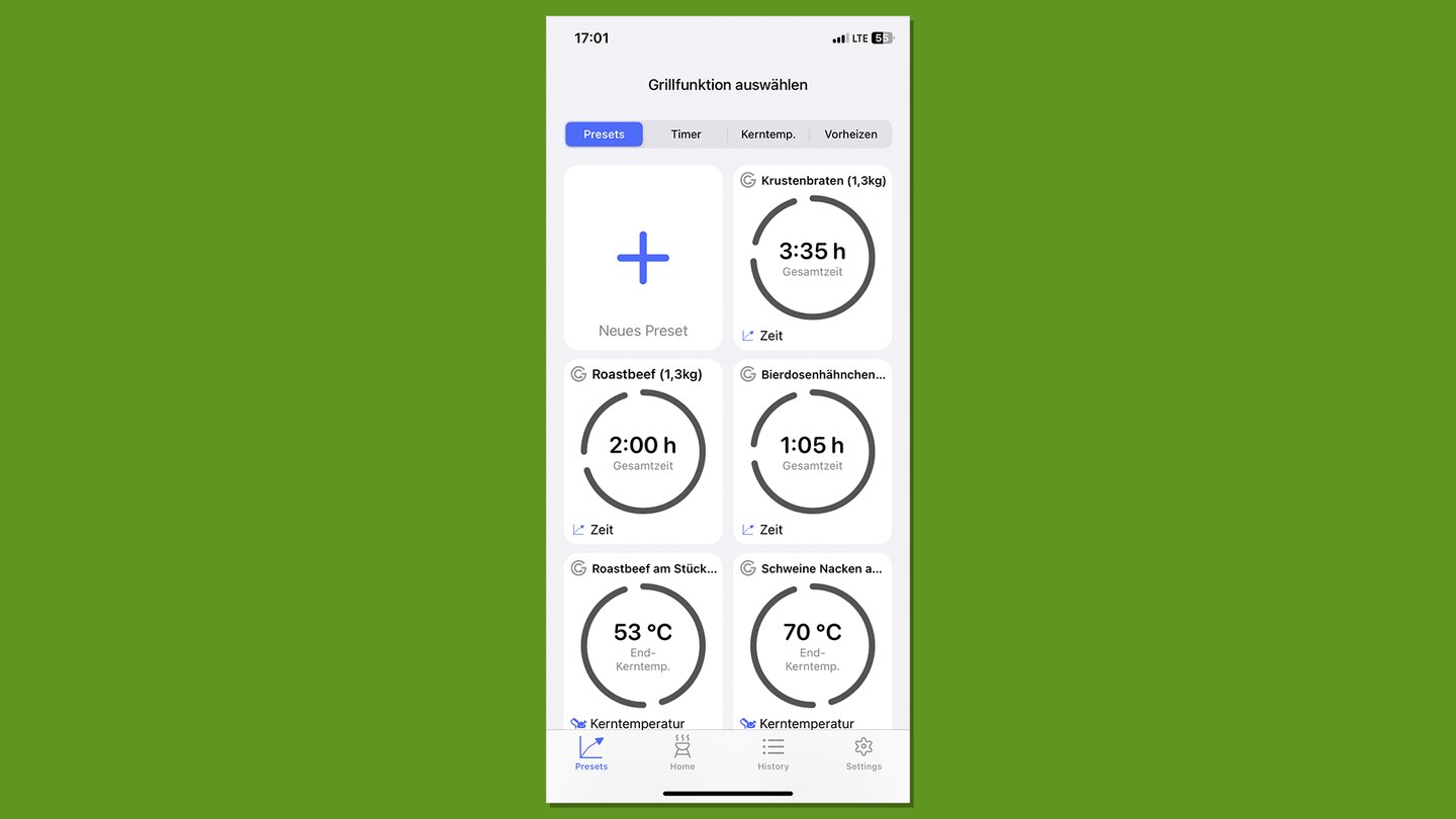 Dabei sind gerade die Presets verdammt hilfreich - zumal man selbst welche anlegen kann: Gewicht und Größe des Fleischstücks, erwünschte Kern- oder Außentemperatur und ein Timer lassen sich spielend eingeben und speichern.