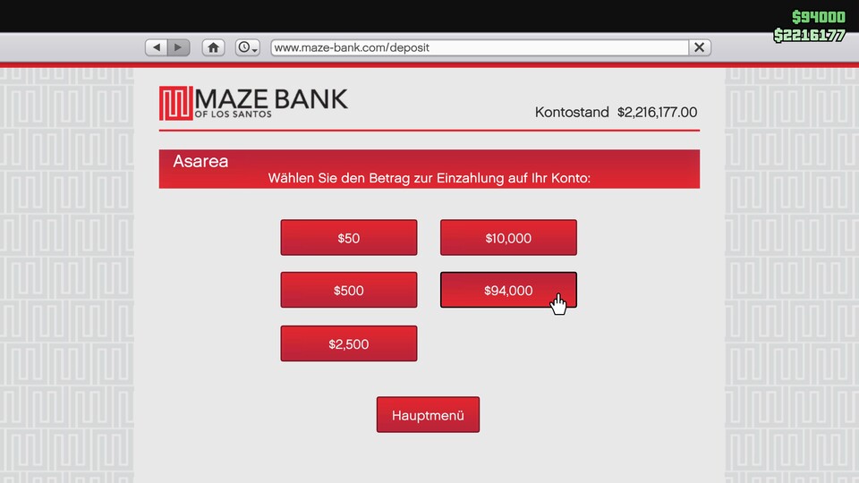 - Klickt danach auf »Hauptmenü« und »Einzahlung«, wählt den höchstmöglichen Einzahlungsbetrag mit einem weiteren Klick aus - fertig!