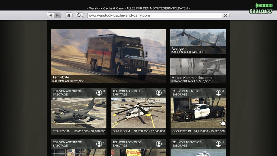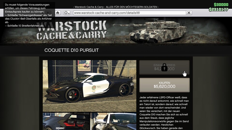 Ruft ihr beispielsweise über euer Ingame-Handy im Internet die Seite »Warstock Cache & Carry« auf, seht ihr bei den einzelnen Angeboten Preise, die sich in einem bestimmten Rahmen bewegen. Welche Aktivität ihr für die Freischaltung des Rabatt-Preises abschließen müsst, wird auf der Fahrzeug-Kaufseite angezeigt.