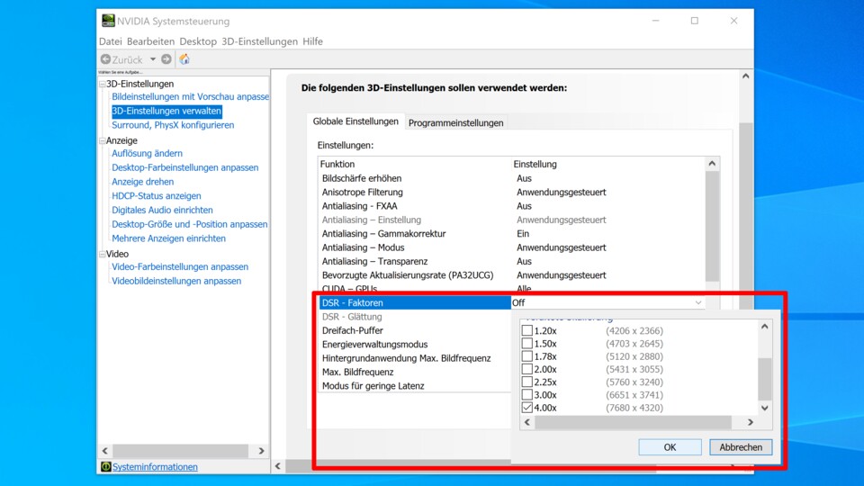 Funktioniert das auch mit Breitbild-Formaten wie 21:9 und 32:9? Ja, auch mit solchen Monitoren könnt ihr die intern berechnete Auflösung per Downsampling erhöhen. Auf einem 32:10-TFT mit nativer Auflösung von 3840x1200 stehen dann etwa Auflösungen wie 5120x1600 (Faktor 1,78), 5760x1800 (Faktor 2,25) und maximal 7680x2400 (Faktor 4) zur Wahl.