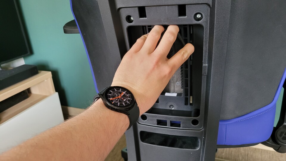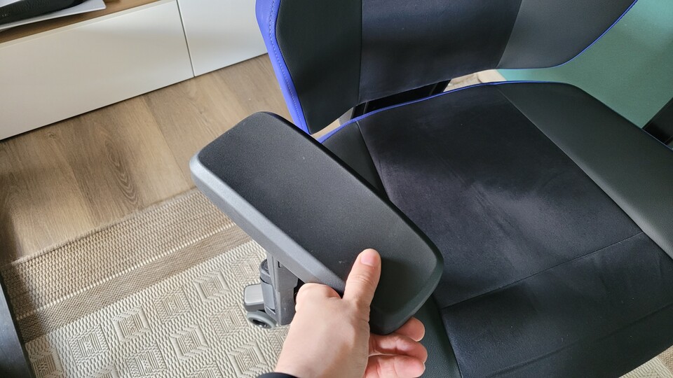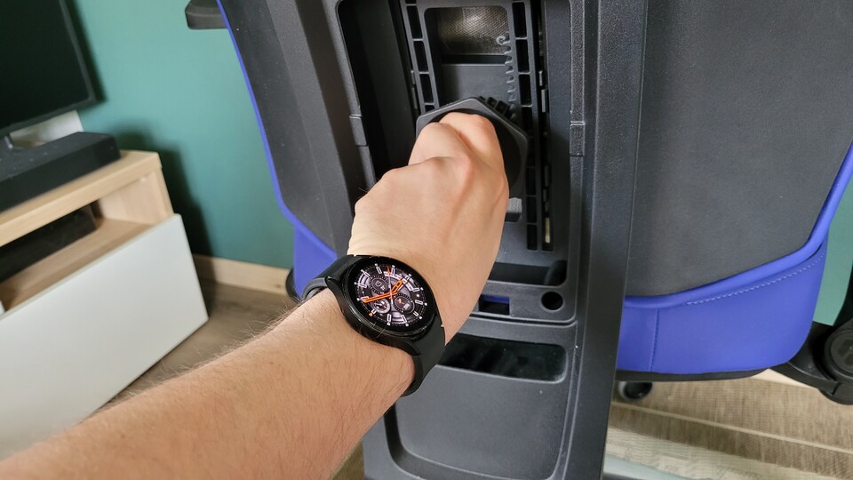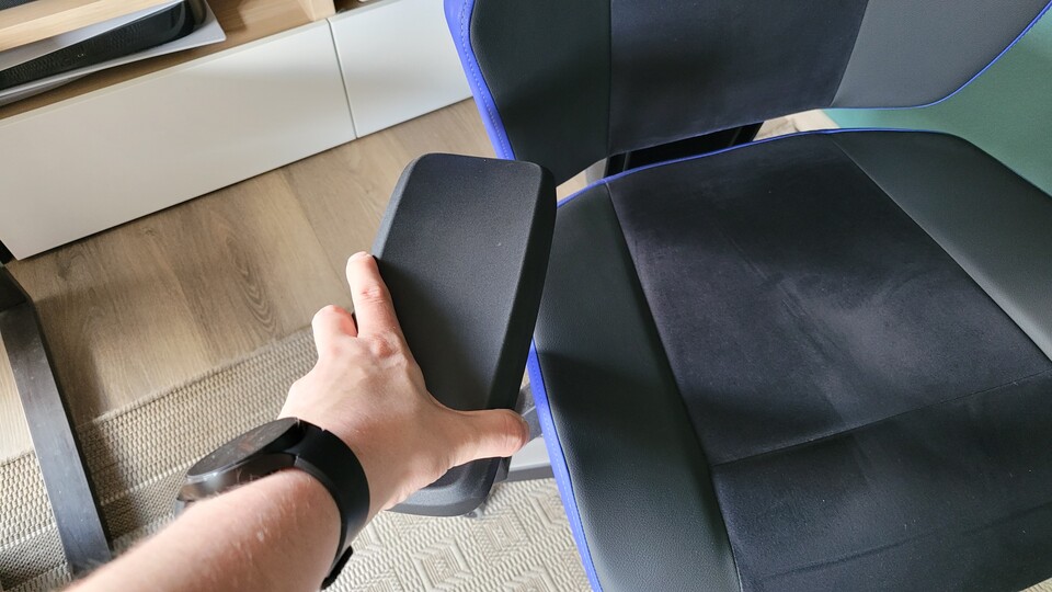 Ein Handgriff reicht, um die Armlehnen nach hinten wegzuklappen. Entweder ihr zieht sie so wie ich nach oben, oder hebt sie von unten an. Danach klappt man sie einfach nach hinten weg. Wollt ihr sie wieder haben, zieht ihr sie einfach in die Ausgangsposition zurück. Die Funktion ist für mich echt Gold wert, wenn ich von meinem Schreibtisch an meinen "Werktisch" wechsle, um an PCs rumzudoktern. Mit meinem alten Bürostuhl waren mir dabei die Armlehnen oft im Weg – beim neuen Stuhl sind die im Nullkommanix weg.