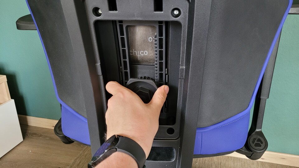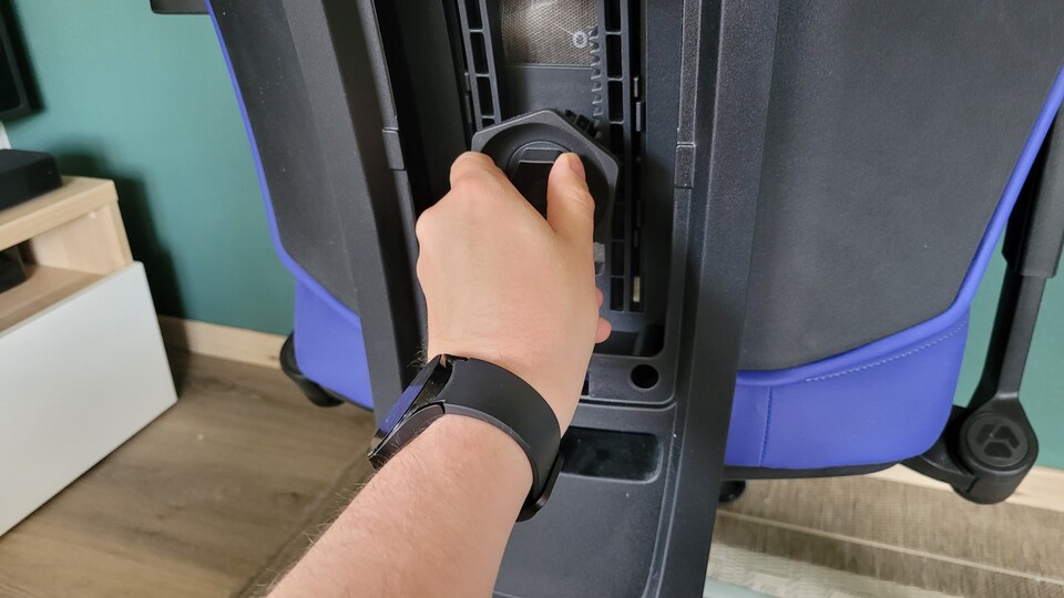 Die Höhenverstellung ist gut erreichbar und mit nur einem Handgriff angepasst. Mit dem Drehregler davor stellt ihr ein, wie hoch der Widerstand der Rückenlehne beim Zurücklehnen ist.