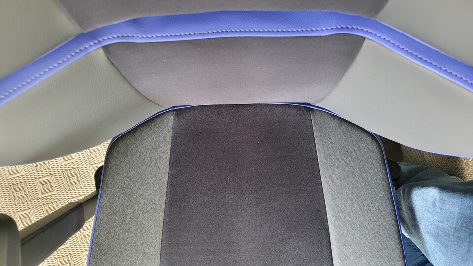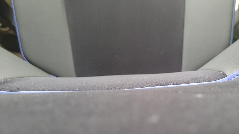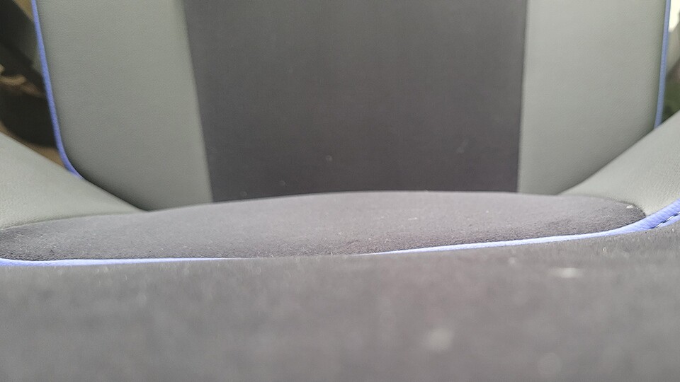 Die Außenbahnen und die blauen Akzente an den Rändern sind aus hochwertigem Kunstleder, fassen sich richtig angenehm an und geben seitlich Halt, damit man nicht schief auf dem Stuhl rumhängt. Dank der leicht nach innen geneigten Seiten des Sitzes fühlt man sich ein wenig wie in einem Sportsitz im Auto, was mir echt gut gefällt.