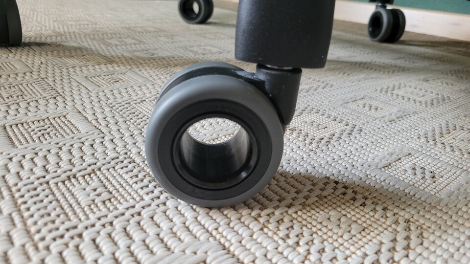 Die Design-Rollen sehen nicht nur schick aus, sondern sorgen durch ihre leichte Bremsung auch dafür, dass ich mich nicht versehentlich nach und nach vom Schreibtisch entferne. Und er bleibt auch an Ort und Stelle, wenn man mal hektisch drauf rumwackelt. Muss ich ihn dann doch mal beiseiteschieben, ist er dabei schön leise.