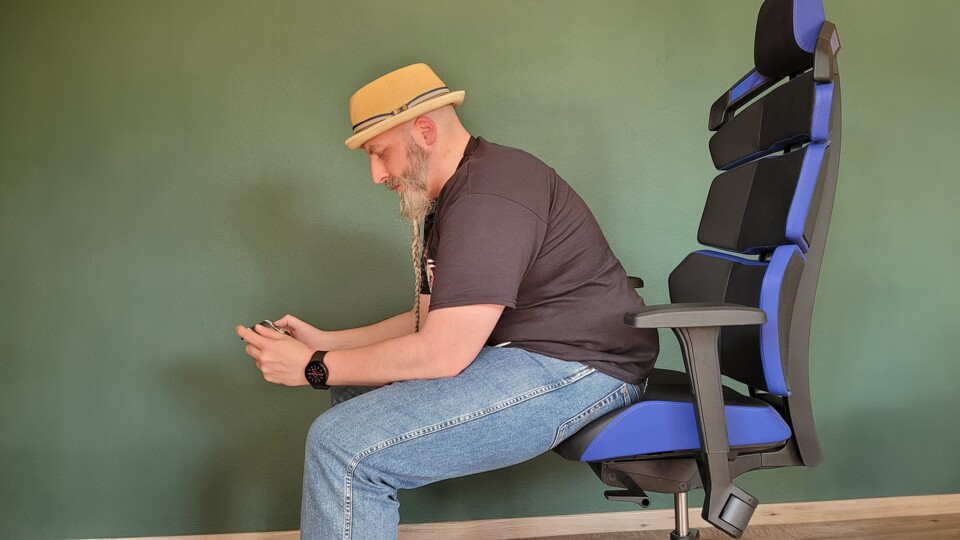 Auf den Bildern ist gut zu erkennen, wie sich die Sitzfläche automatisch der Neigung der Rückenlehne anpasst. Das ist der verbauten Synchronmechanik zu verdanken. Je nach Position der Rückenlehne passt sie die Sitzfläche in einem festen Verhältnis von 2,7:1 an. So bleibt die Ergonomie selbst dann gewährt, wenn man sich mit seinem Handheld entspannt zurücklehnen will.