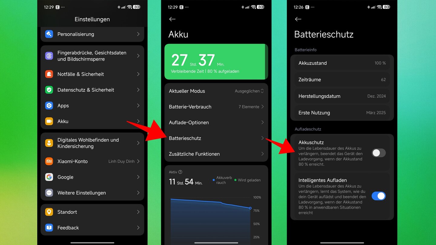 Navigiert zu Einstellungen → Batterie → Batteriezustand & Ladevorgang und schaltet die Option »Optimiertes Laden der Batterie« ein.