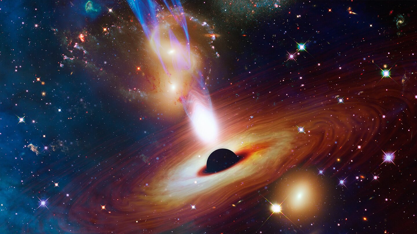 Im Zentrum (fast) aller großen Galaxien sitzt ein supermassereiches Schwarzes Loch. Verschlingt es große Mengen an Materie, bildet sich eine glühende Akkretionsscheibe, in der Gas und Staub mit einem hohen Prozentsatz der Lichtgeschwindigkeit kreisen, wie Funken auf einem gigantischen kosmischen Mahlstrom.