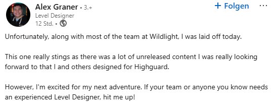 Die Nachricht verbreitete sich wie ein Lauffeuer über LinkedIn, wo betroffene Entwickler ihren Frust und ihre Trauer teilten. Allen voran Level Designer Alex Graner fand deutliche Worte für die Situation.