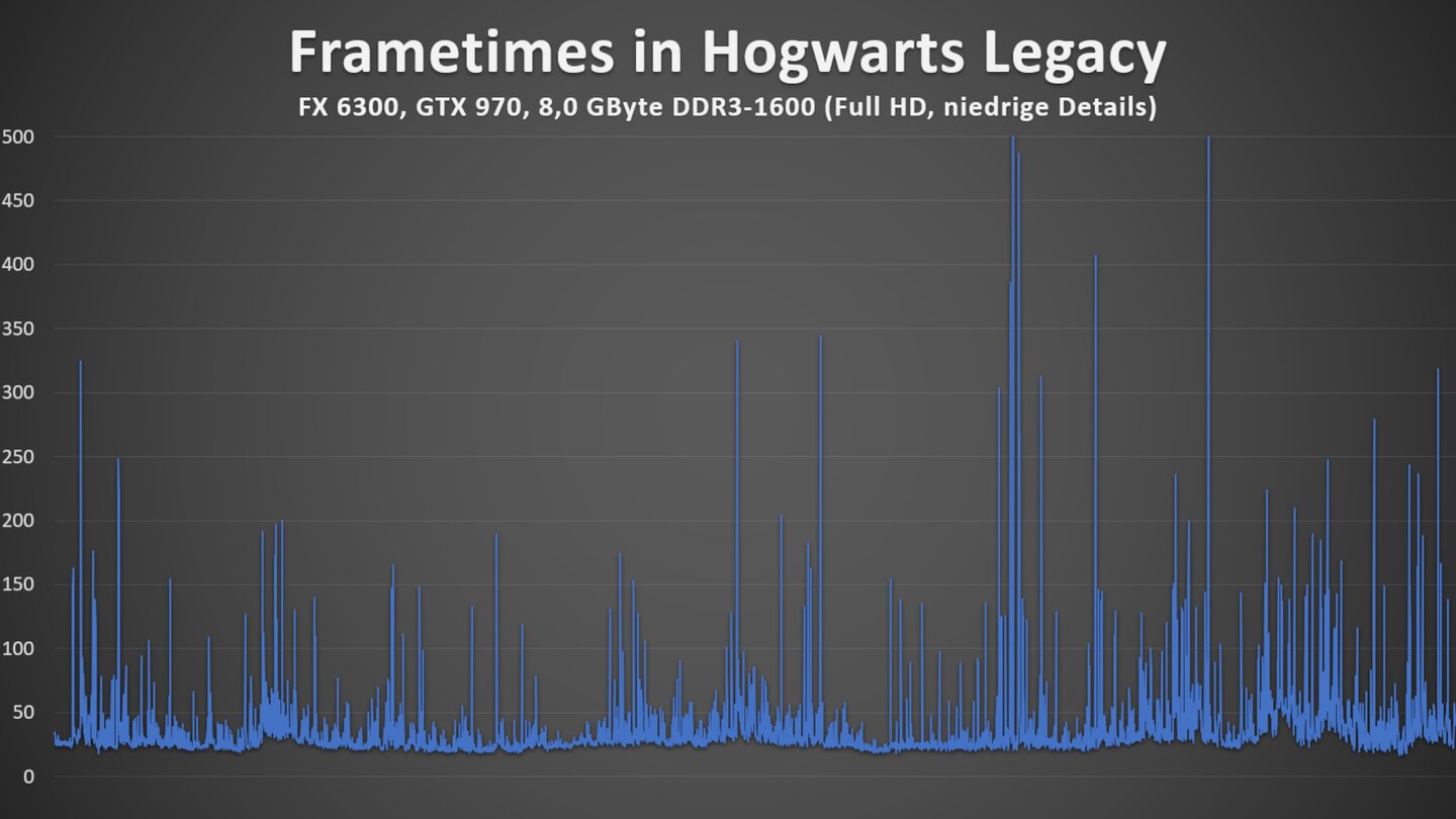 Das klar größere Problem sind allerdings die minimalen FPS (99tes Perzentil) von nur 6,5 FPS beziehungsweise die Frametimes. Es kommt also immer wieder zu kleineren und teils auch zu größeren Rucklern. Das kann in Hogwarts Legacy je nach Hardware und Szene zwar auch mit aktueller Hardware passieren. Bei dem zehn Jahre alten PC ist das Ausmaß aber deutlich größer.