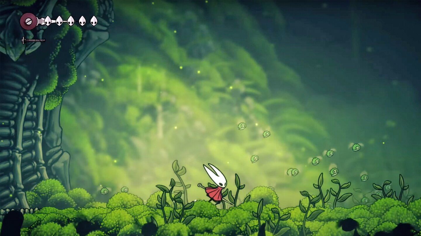 Der ruhige Einstieg wird zusätzlich von der wunderschönen musikalischen Untermalung betont. Ruhige Klänge begleiten mich, während Hornet ihr Bewusstsein wiedererlangt und sich ihre Nadel-Waffe schnappt. Zeit, die neue Welt zu erkunden!