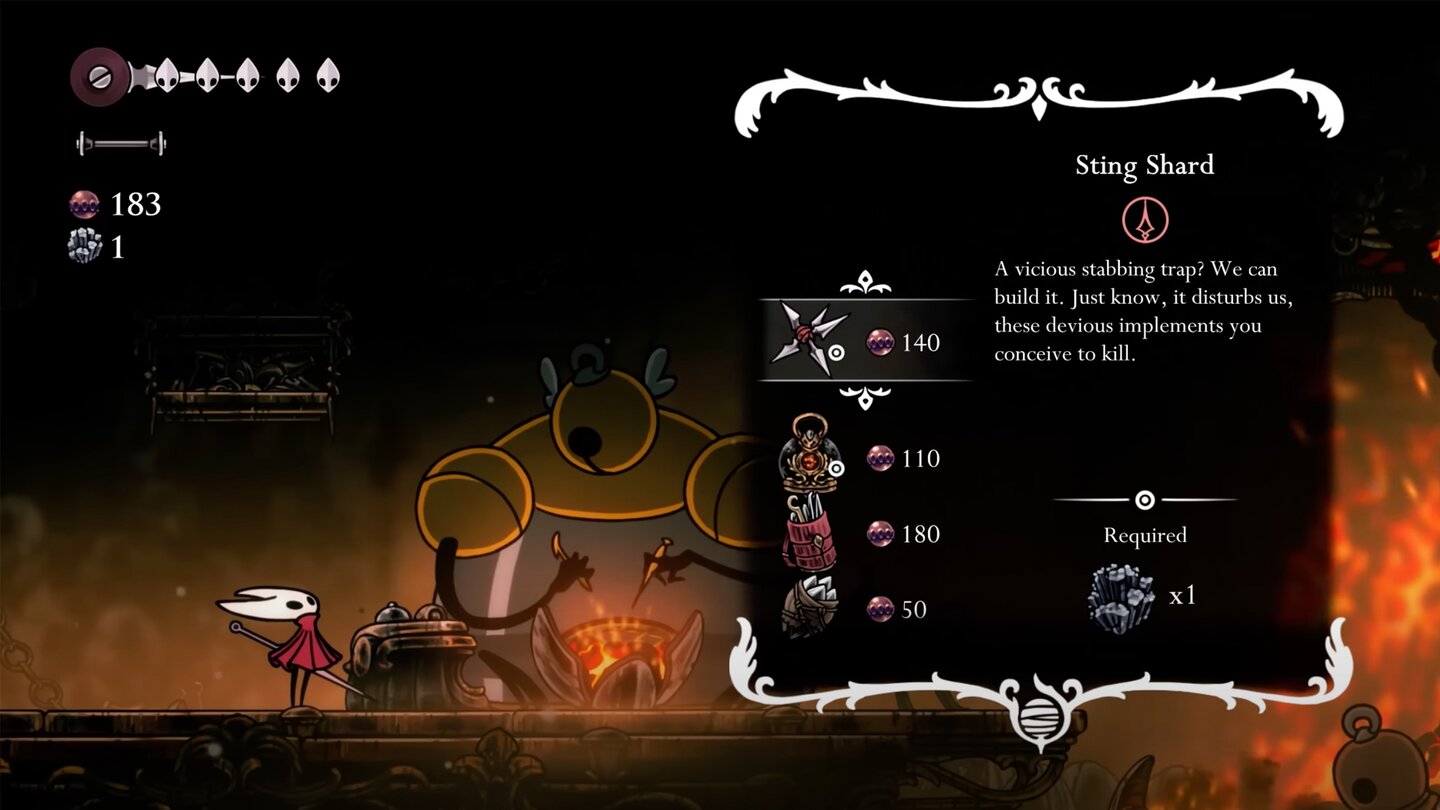 Gegner lassen außerdem Scherben als Währung fallen, mit denen ich später Werkzeuge aufwerten kann. Werkzeuge sind das Äquivalent zu den Fähigkeiten aus dem ersten Teil, die Hornet neue Skills und stärkere Angriffe verleihen — die konnte ich allerdings noch nicht ausprobieren.