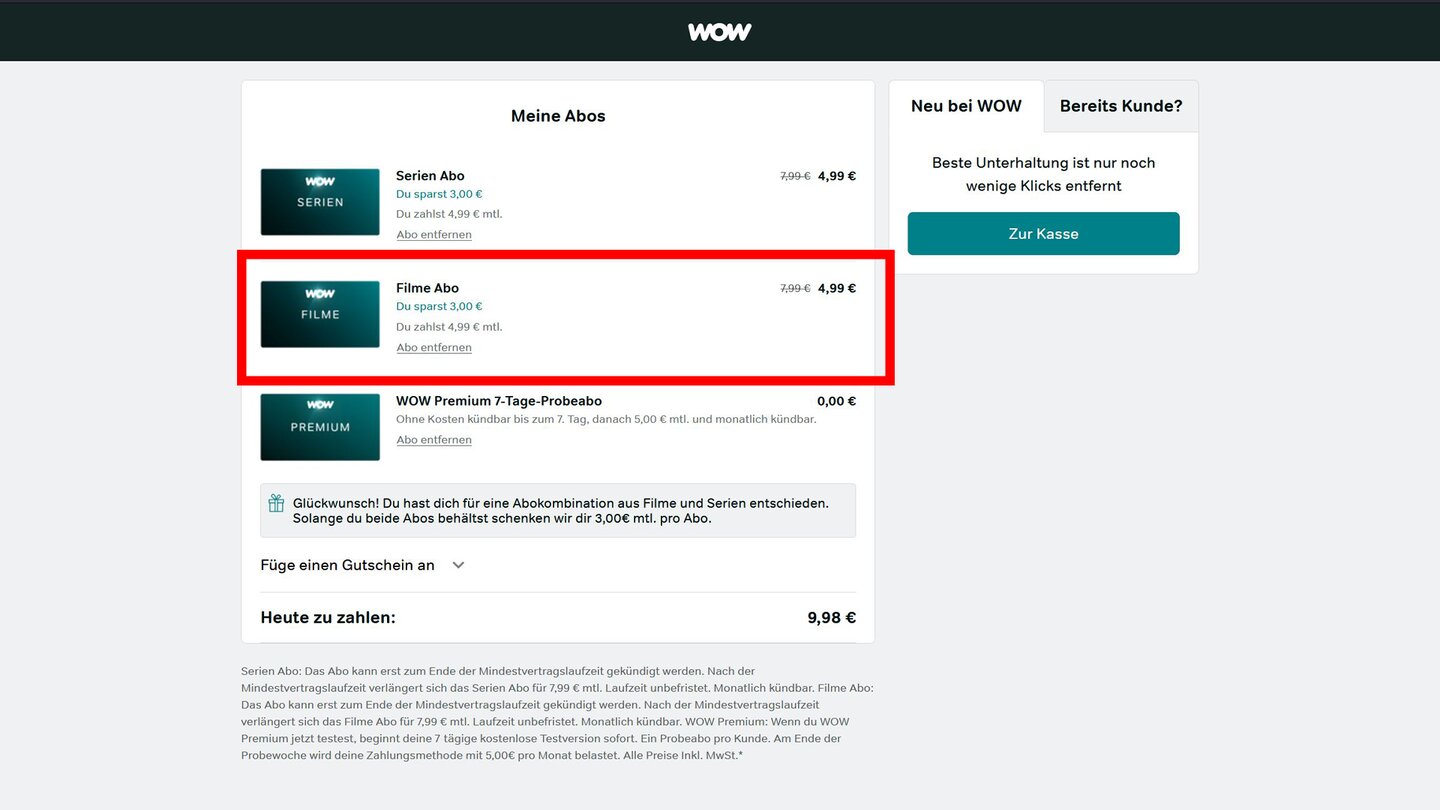 Beachtet außerdem das Sonderangebot von WOW. Der Anbieter wirbt mit 5,98 Euro im Monat für Filme und Serien.