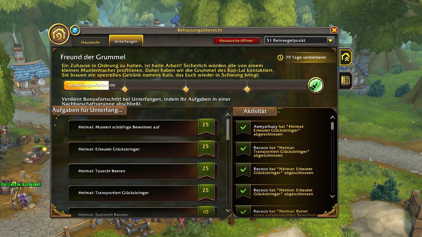 Um ein Unterfangen erfolgreich abzuschließen, müssen die Bewohner verschiedene Aufgaben bewältigen. Das System wird euch sofort vertraut vorkommen, da es eins zu eins der Logik des Handelspostens folgt. Zu den Aufgaben gehören Klassiker wie das Absolvieren von zehn Weltquests, das Sammeln von Ressourcen oder das Abschließen von fünf Instanzen.