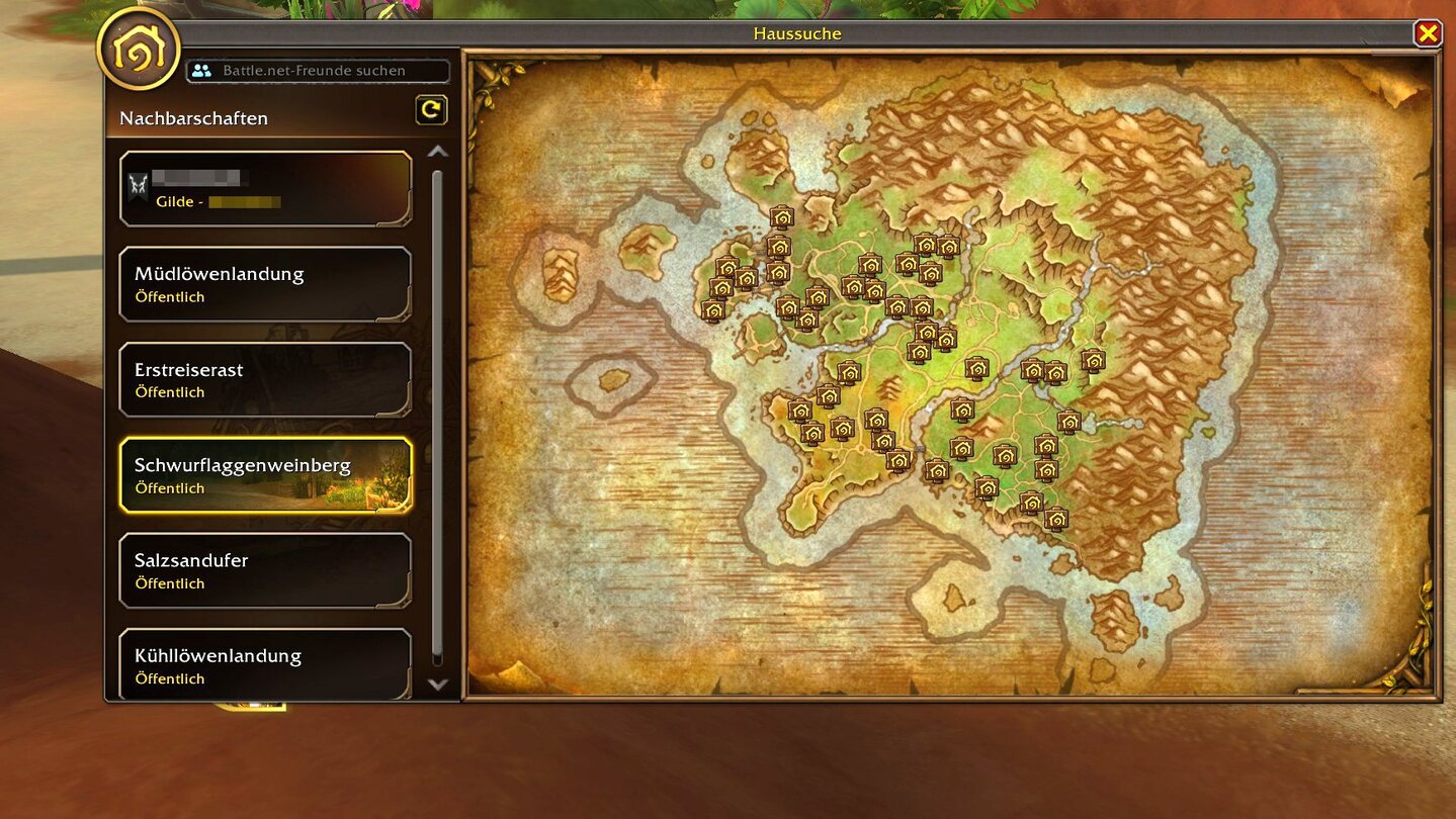 Ist unser Lieblingsplatz nicht frei? Einfach auf das Aktualisieren-Symbol drücken und uns werden fünf neue vorgeschlagen. Gildennachbarschaften werden uns stets als Erstes angezeigt, und über ein Suchfeld können wir auch die öffentlichen Nachbarschaften suchen, auf denen alle unsere Battle.net-Freunde ihr Unwesen treiben!