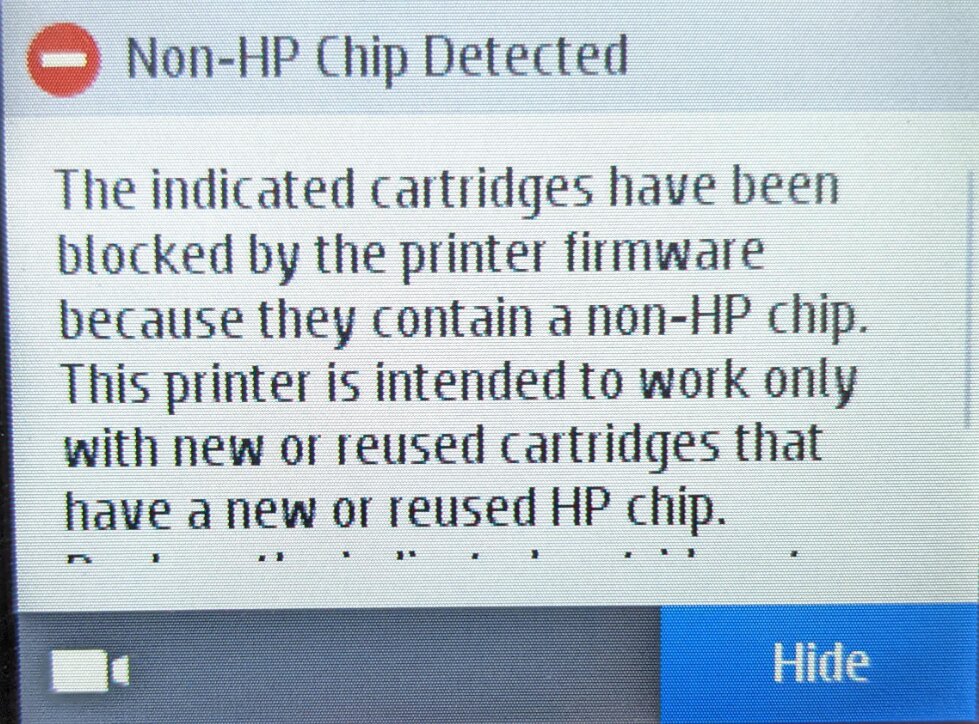 “Die angegebenen Patronen wurden von der Druckerfirmware gesperrt, weil sie einen Nicht-HP-Chip enthalten. Dieser Drucker funktioniert nur mit neuen oder wiederverwendeten Patronen, die einen neuen oder wiederverwendeten HP-Chip enthalten […]"