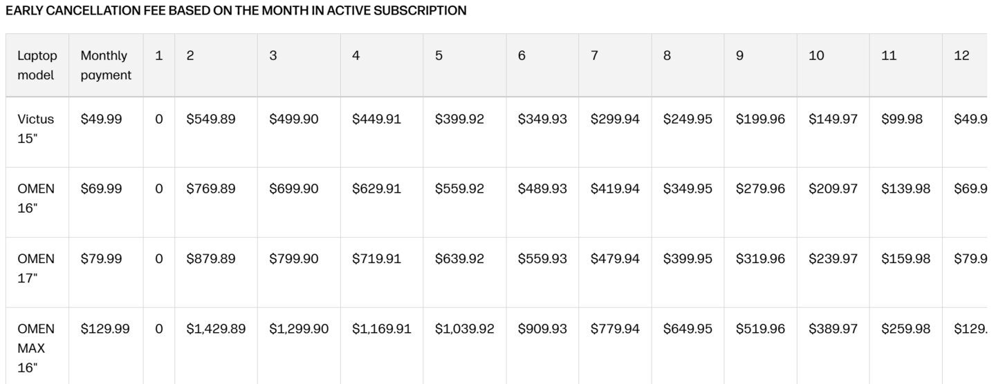 Wollt ihr zum Beispiel das Abo vom Top-Modell OMEN Max 16 bereits im zweiten Monat loswerden, knöpft euch HP satte 1.430 US-Dollar ab! Erst nach dem 13. Monat ist eine Kündigung ohne zusätzliche Strafzahlung möglich. Sollte das Unternehmen dieses Modell irgendwann in dieser Form auch hierzulande anbieten, dürfte sich der Verbraucherschutz vermutlich die Hände reiben.