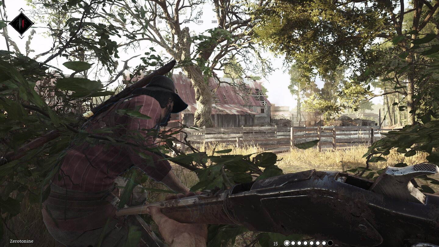 Die Schießereien laufen in Hunt übrigens weitaus weniger sportlich und dynamisch ab, als man das sonst aus modernen Shootern gewohnt ist. Jeder Schuss fühlt sich mühevoll und wichtig an. Schon allein, weil Munition immer eine knappe Angelegenheit ist. Aber auch, weil das Zielen vergleichsweise anstrengend ist und die Kugeln wahnsinnig langsam fliegen. Vielleicht ist es aber auch ein noch nicht ganz ausgereifter Netcode, der dafür sorgt, dass zwei von drei Schüssen danebengehen. Schließlich ist Hunt: Showdown noch in der geschlossenen Alpha.