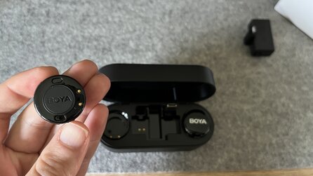 Im schicken, kleinen Ladecase (erinnert stark an Apples AirPods Pro) befinden sich zwei Mikrofone und ein kleiner Empfänger. Den gibt es wahlweise als USB-C- oder Lightning-Version. Ihr müsst euch also entscheiden – und seid im Zweifel nicht so flexibel wie beim höherpreisigen Boya Link 3 oder Magic.