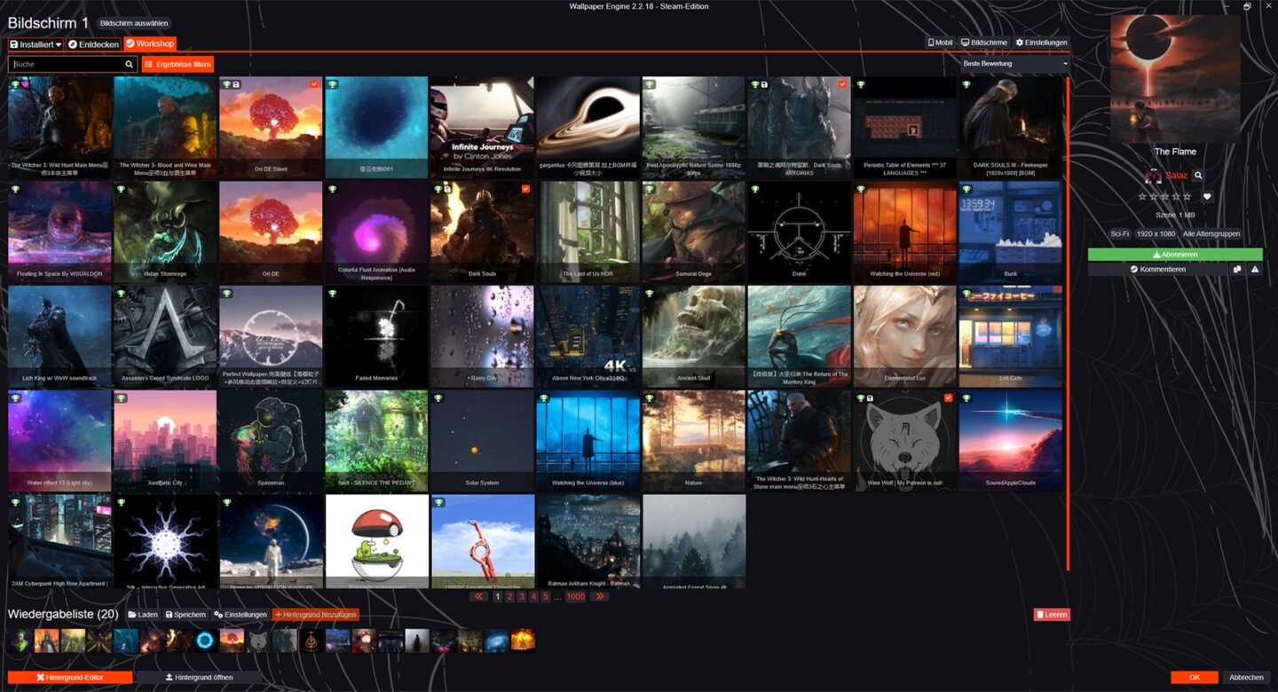 Kommen wir zum, für mich, größten Spaßfaktor der Wallpaper Engine: Gut animierte Kunstwerke meiner liebsten Franchises oder Hobbys durchstöbern und sie reihenweise in die Hintergrund-Playlist packen.
