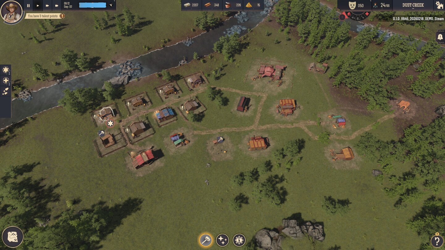 Später lege ich den Grundstein für eine zweite Siedlung in einem eher sandigen, felsigen Gebiet in der Nähe einer Mine – da entsteht direkt deutlich mehr Westernatmosphäre, doch die Demo ist vorbei, sobald es dort richtig losgeht.