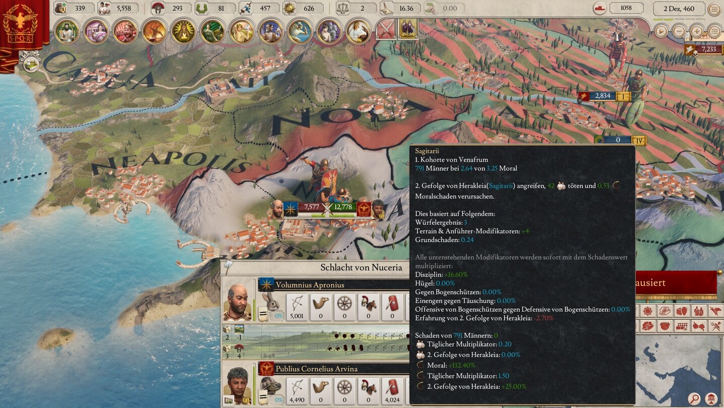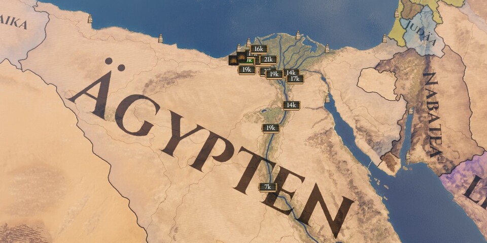 Unterteilt ist diese riesige Spielwelt in tausende kleine Stadtgebiete. Während in Europa Universalis 4 beispielsweise Sizilien noch aus drei Provinzen besteht, waren es in Hearts of Iron 4 immerhin schon neun, in Imperator: Rome hingegen ist Sizilien in 23 (!) Städte gegliedert. Vor allem in den Feldzügen zahlt sich diese Kleinteiligkeit aus: Das Taktieren wird dadurch deutlich anspruchsvoller, da man die unterschiedlichen Terrains, Flussüberquerungen, unwegsamen Gebiete und die Kontrollzonen der Festungen noch intensiver berücksichtigen kann.